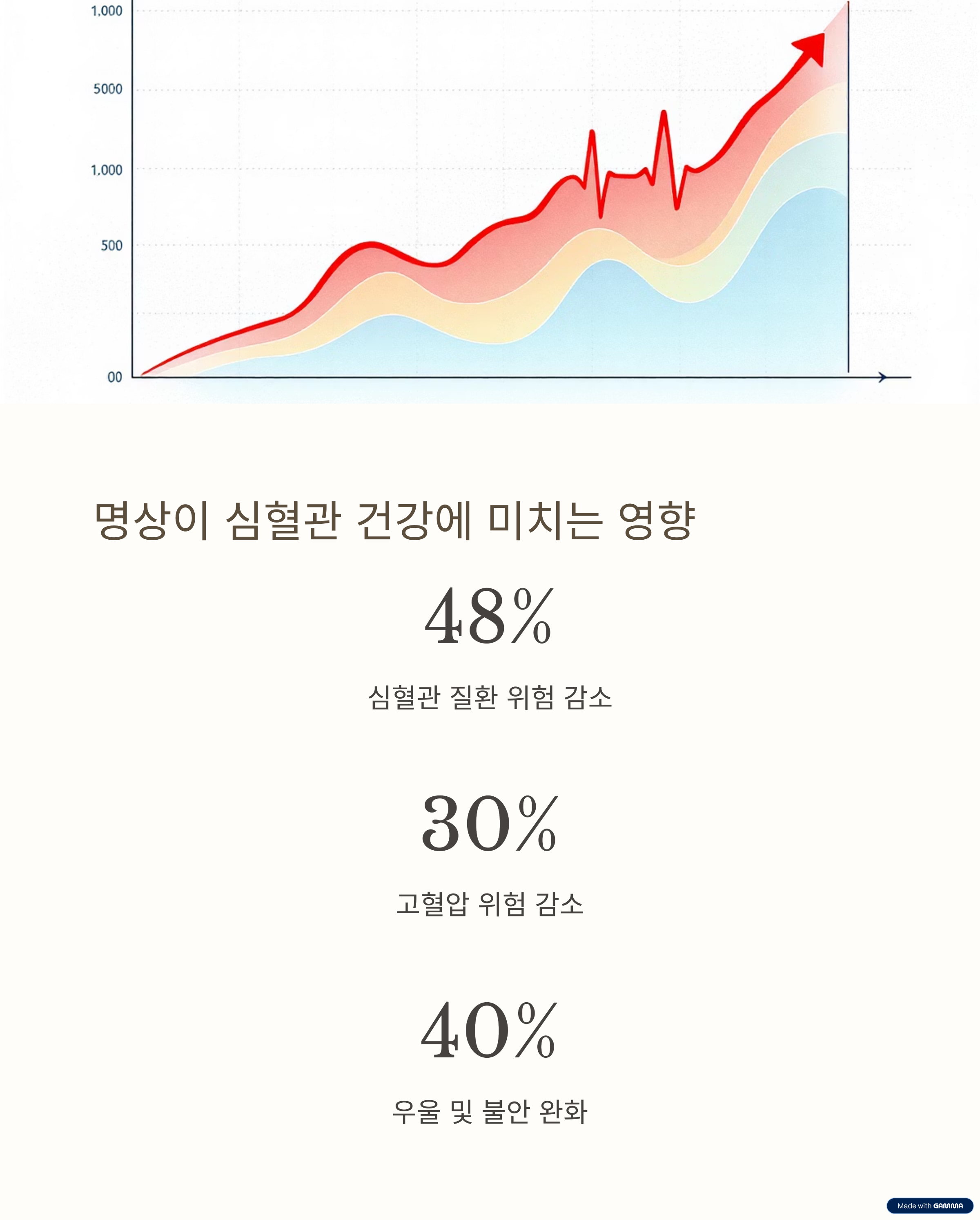 사실 이건 좀 놀라운 이야기인데요. 미국에서 성인 6만여 명을 대상으로 한 대규모 연구 결과, 명상을 꾸준히 실천한 사람들이 그렇지 않은 사람들에 비해 심혈관 질환 위험이 눈에 띄게 낮았대요. 단순히 기분이 좋아지는 걸 넘어서, 실제로 고혈압, 당뇨, 심장마비, 심지어 뇌졸중까지! 전반적인 리스크가 감소하는 효과가 있었다고 해요.