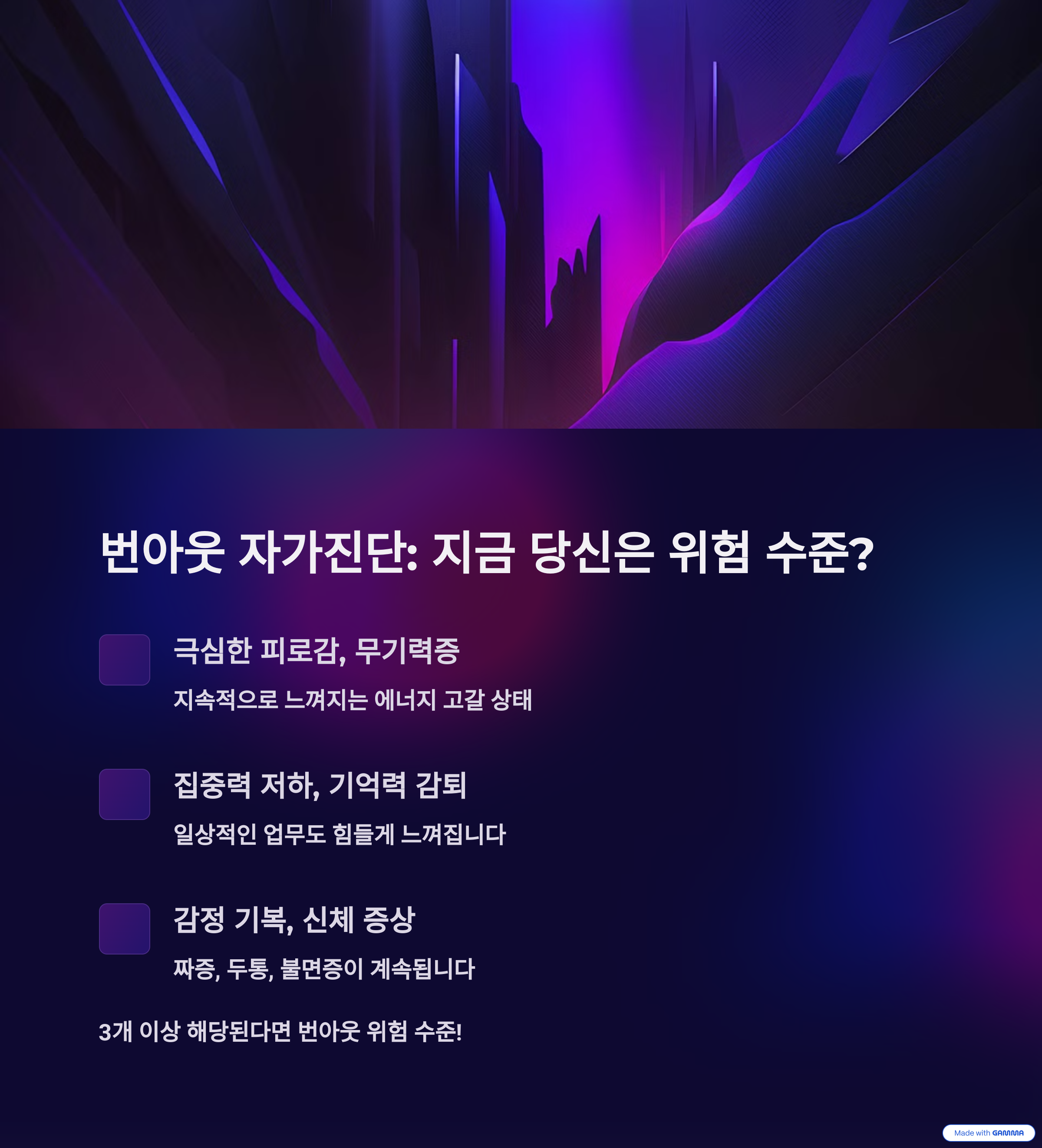 의학적으로도 번아웃은 ‘만성 스트레스에 의한 정서적, 신체적, 정신적 탈진 상태’로 분류됩니다. 특히 직장인에게는 단순한 지침을 넘어, 생산성과 삶의 질에 심각한 영향을 끼치죠. 그래서 중요한 건, ‘그냥 피곤한 거겠지’ 하고 넘기지 않는 겁니다.