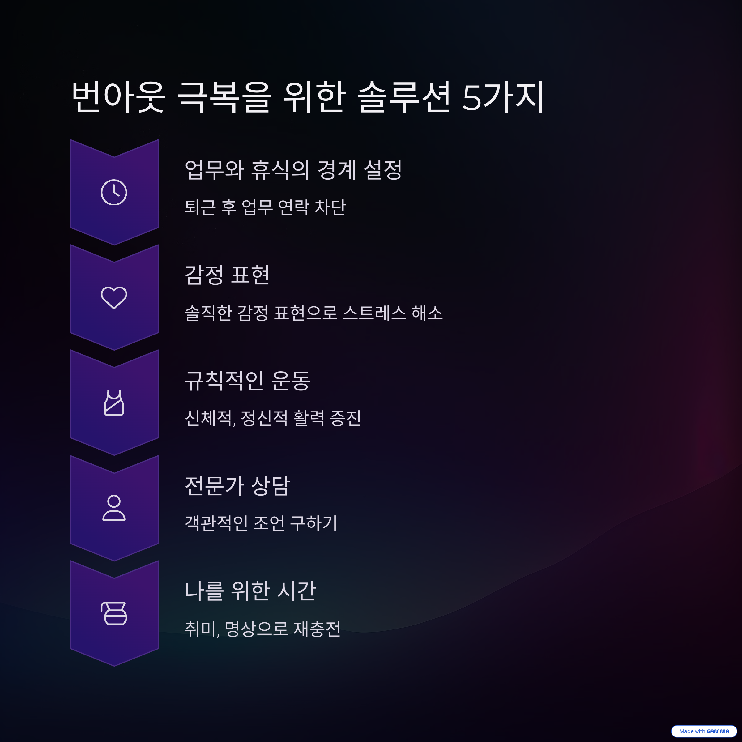 번아웃은 무작정 쉰다고 해결되지 않아요. 뇌의 SOS를 진짜로 끄기 위해서는 체계적인 회복 전략이 필요합니다. 제가 실제로 효과를 본 다섯 가지 방법을 소개할게요.