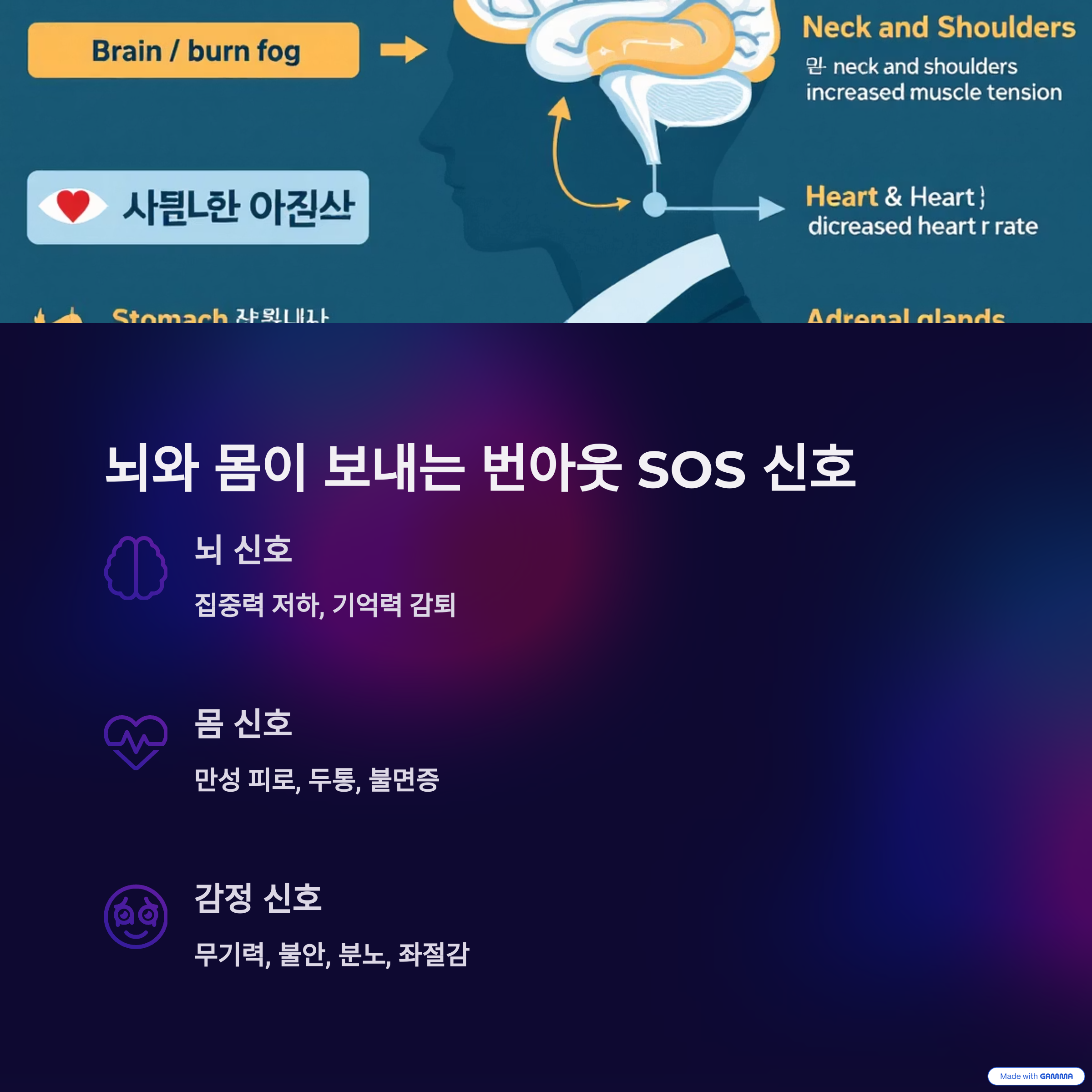 아침에 눈을 떴는데 몸이 천근만근처럼 느껴지고, 출근길 지하철 안에서부터 벌써 뇌가 멍해지는 기분... 혹시 그런 경험 있으신가요? 저는 한동안 그런 상태가 계속되었어요. "그냥 좀 피곤한가 보다" 하고 넘기기엔 뭔가 이상하더라고요. 자꾸 실수를 반복하고, 사람들과 대화도 피하게 되고, 심지어 좋아하던 일조차 귀찮게 느껴졌거든요. 그땐 몰랐죠. 뇌가 이미 ‘그만 좀 하라’며 SOS를 보내고 있었던 걸요.